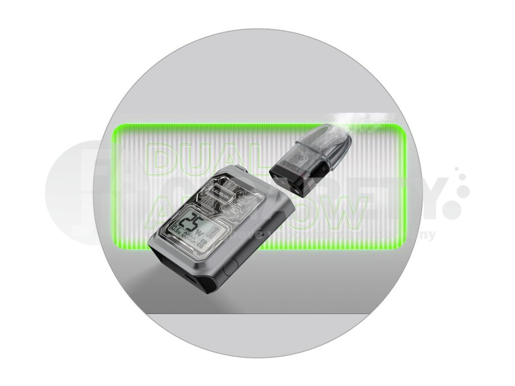 Přední část zdobí krásný segmentový digitální LCD displej, který umně dokresluje celkový vzhled zařízení. Výhodou segmentového displeje je zejména nižší odběr energie během používání, displej tak značně šetří vaši baterii, kterou spotřebováváte téměř výhradně pouze vapováním. Na displeji budete mít navíc neustálý přehled o všech potřebných parametrech během používání.