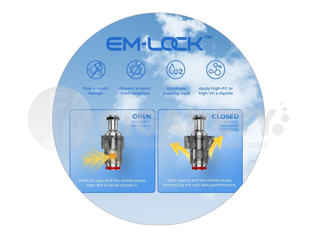 Technologie EM-LOCKTM nabídne ještě jednu praktickou vlastnost. Díky uzavíratelnému mechanismu přívodu e-liquidu můžete v zařízení používat rozdílné typy e-liquidů s různými hustotami. Nemusíte se tak omezovat pouze na standardní náplně s poměrem PG50/VG50, můžete použít také jiné poměry PG a VG složek.