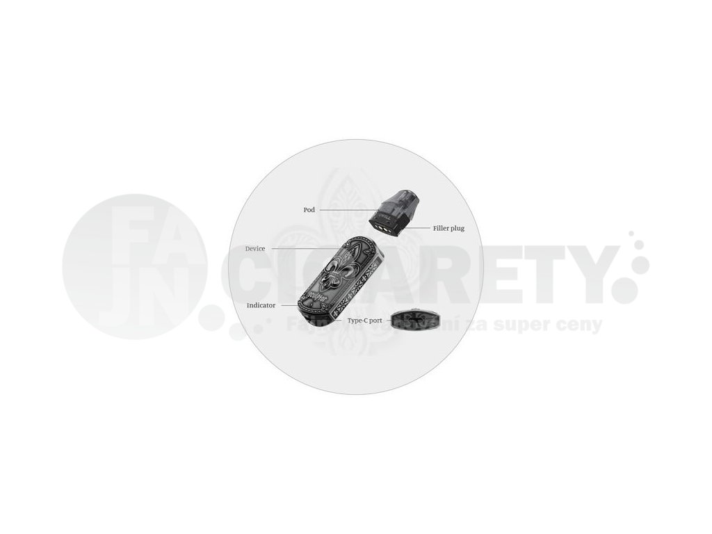 S netradičně zpracovanou a nádhernou e-cigaretou přichází výrobce Uwell. Model s názvem Uwell Sculptor Pod Kit se může pyšnit elegantní kovovou konstrukcí celého těla, které je výsledkem dlouhotrvajícího a pečlivého vývoje návrhářů této renomované společnosti. Kovové tělo zařízení potom zdobí nádherná rytina v podobě Fleur de lis, heraldického znaku lilie. Celé zařízení budí dojem luxusu také díky velkému množství barevných zpracování, ve kterých se vyrábí. Rozměry těla činí krásných 32.6 x 15 x 77.1 mm, zařízení perfektně padne do dlaně a příjemně se používá. V jeho těle se nachází integrovaná baterie s kapacitou 370 mAh, která je vhodná pro utaženější MTL potahování. V případě nutnosti budete moci baterii dobíjet prostřednictvím USB-C portu umístěném ve spodní části těla.