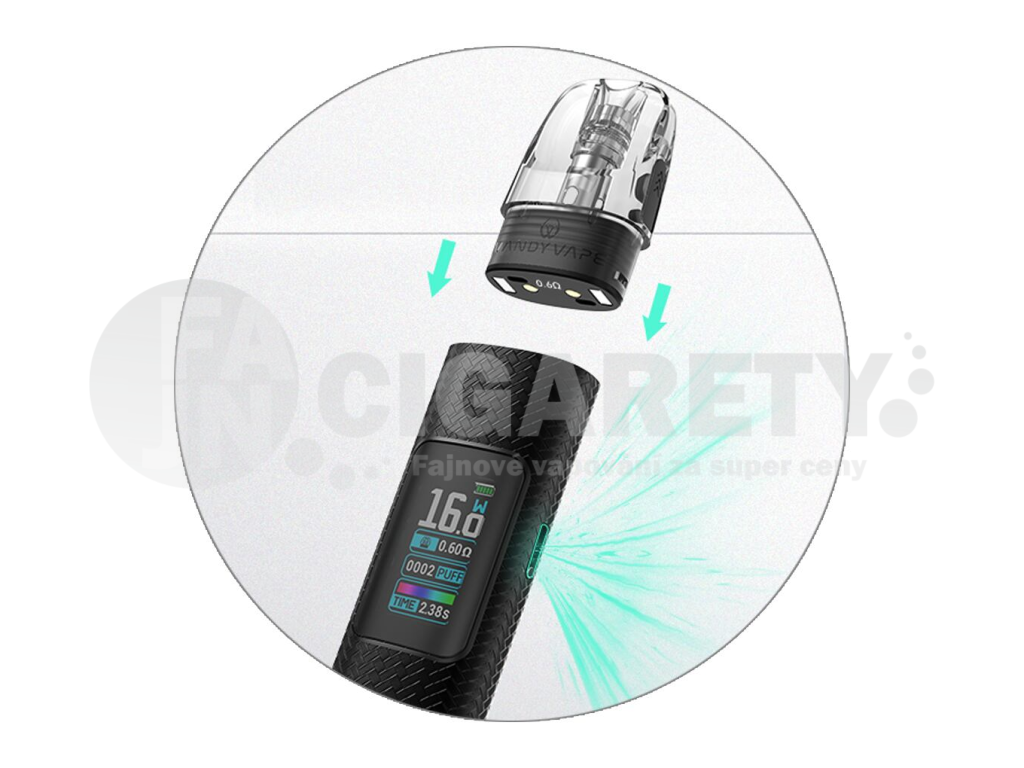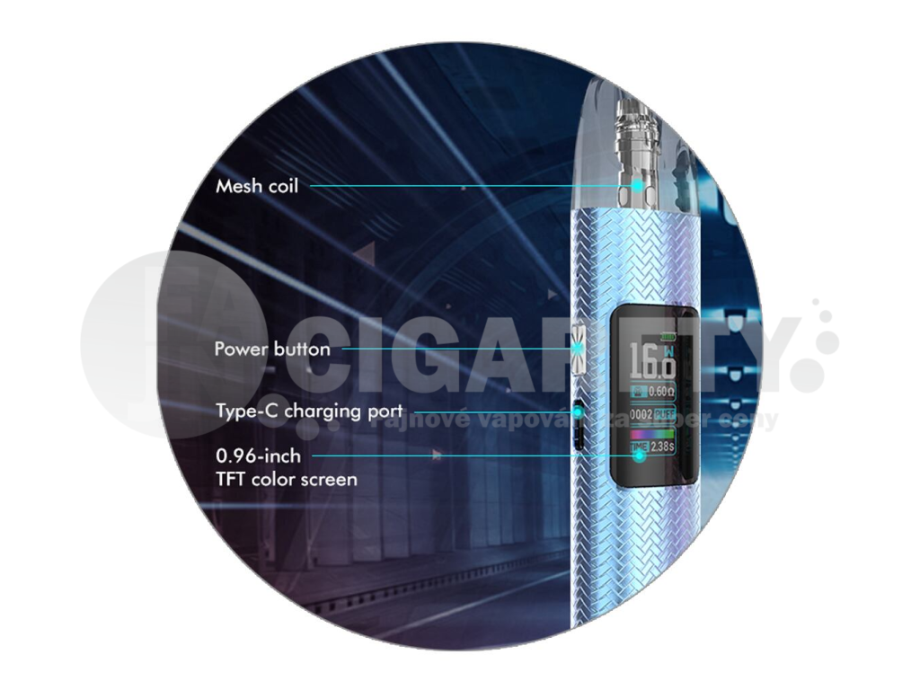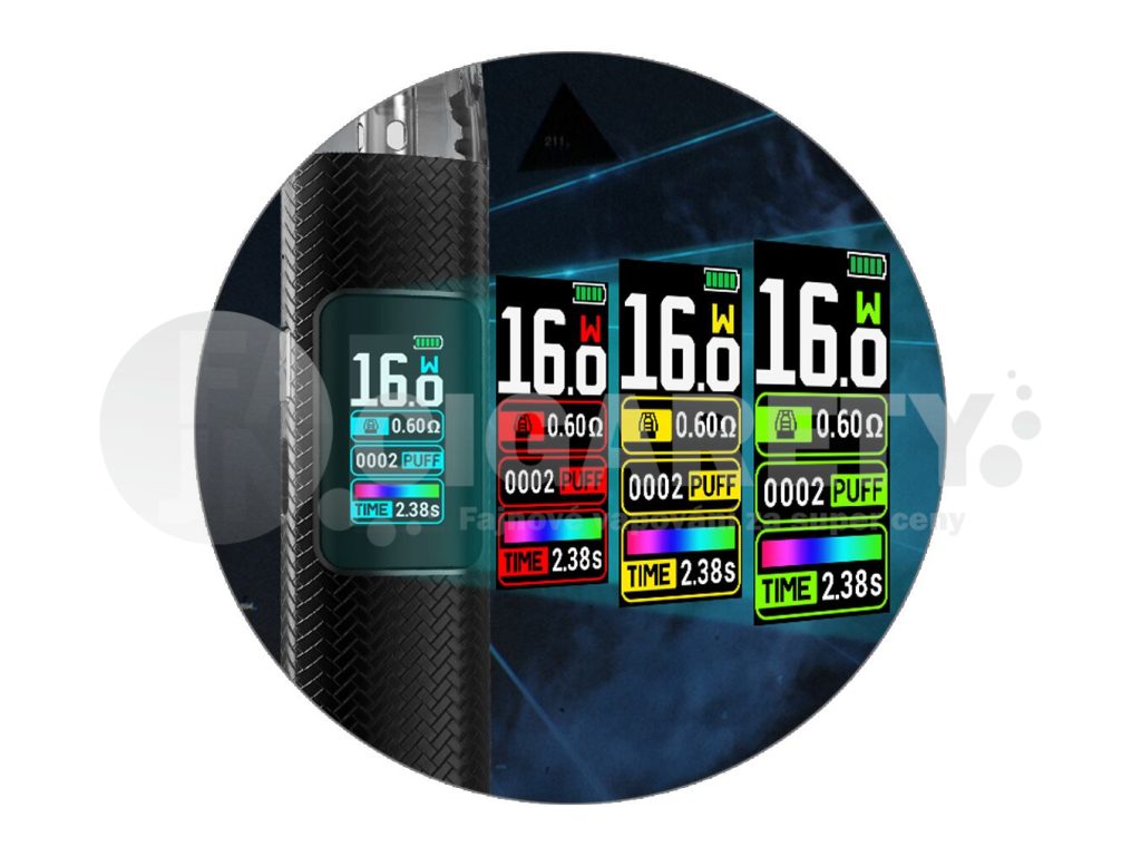 Hlavní výsadou zařízení je barevný TFT displej na předním panelu. Ten vás neustále informuje o stavu baterie, nastaveném výkonu, počtu potahů, odporu cartridge a čase posledního potahu. Díky barevnému rozhraní je nastavení jednodušší, než kdykoliv předtím.