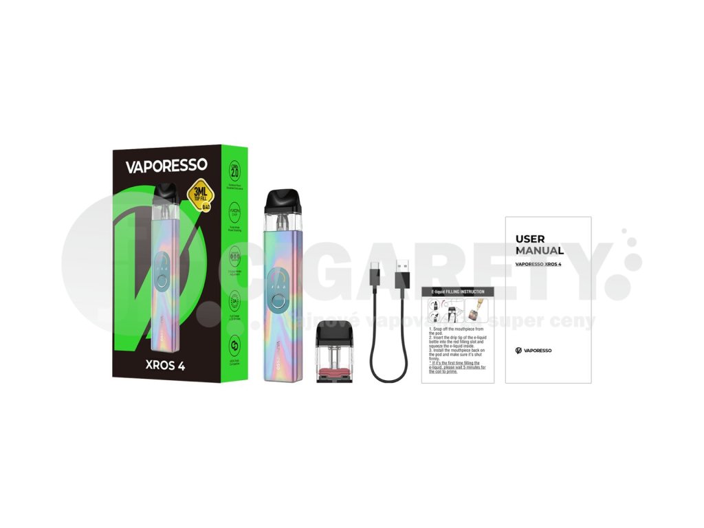 Čtvrtá generace oblíbené modelové série XROS s názvem Vaporesso XROS 4 Pod Kit uvádí na trh vylepšenou technologii COREX 2.0 pro mnohem intenzivnější chuť a delší životnost cartridgí. Výkonný Pulse režim zajistí vysoký výstupní výkon a rychlý náběh žhavení. U e-cigarety nesmí chybět ani prvotřídní čipset AXON, tři výstupní režimy intenzity a praktický indikační displej. V základním balení se nachází také nová cartridge s odporem 0,4 ohm, přičemž je zařízení zpětně kompatibilní také s kompletní platformou všech dalších podů XROS. Novinkou je také přepracované tělo s celohliníkovou konstrukcí pro komfortnější stisk, nižší hmotnost a ještě futurističtější estetiku.