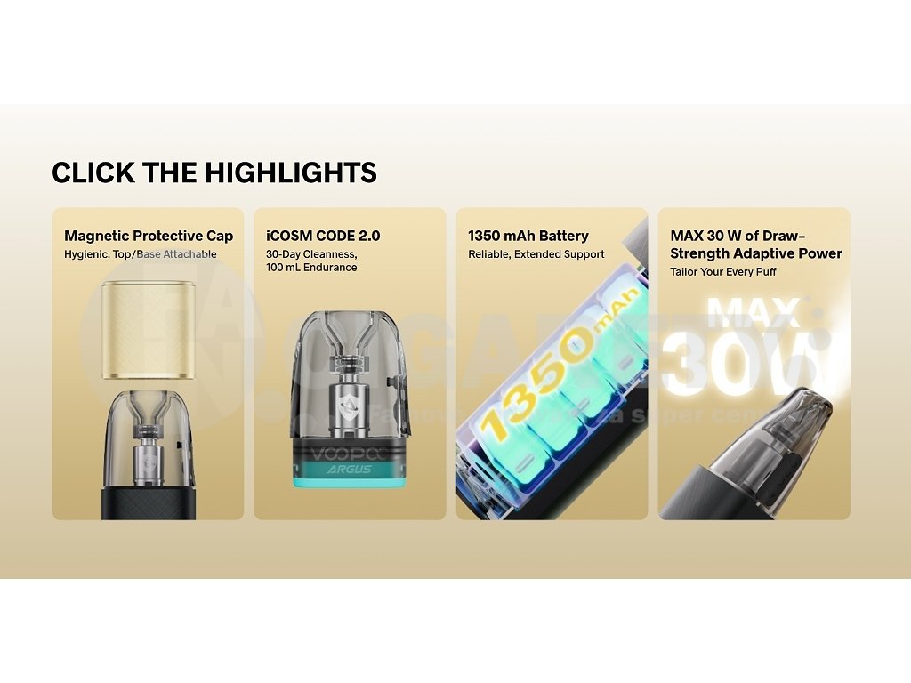 Technologické srdce Argus Klyc tvoří pokročilý čip s inteligentním rozpoznáváním, který vyhodnocuje nejen odpor použitého podu, ale také sílu potahu a automaticky upravuje parametry pro optimální výkon. Technologie iCOSM Code 2.0 zajišťuje efektivní nasycování vaty e-liquidem, rovnoměrné odpařování a okamžité žhavení pro bohatý chuťový zážitek. Praktické vrchní plnění podu eliminuje nutnost vyjímání cartridge z těla zařízení – stačí odklopit silikonovou krytku a doplnit oblíbenou náplň. Ergonomický tvar a kompaktní rozměry 100,6 x 29,7 x 17,2 mm činí z Argus Klyc ideálního společníka pro každodenní nošení. Boční posuvník pro regulaci přívodu vzduchu umožňuje nastavit styl vapování od volnějšího pusa-plíce až po těsnější MTL styl. Magnetické připojení víčka představuje praktické řešení – během vapování jednoduše přichytíte víčko na spodní část zařízení pomocí magnetu, takže se nikdy neztratí. Argus Klyc tak kombinuje stylový vzhled, pokročilou funkčnost a maximální pohodlí používání pro náročné uživatele elektronických cigaret.