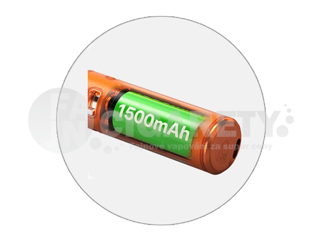 Jádro e-cigarety ukrývá integrovanou baterii s obrovskou kapacitou 1500mAh, která zajistí extrémně dlouhou výdrž na jedno nabití a možnost intenzivního vapování bez nutnosti častého nabíjení. V případě potřeby pak jednoduše připojíte USB-C kabel k dobíjíecímu portu ve spodní části a baterii si kdykoliv pohodlně dobijete.