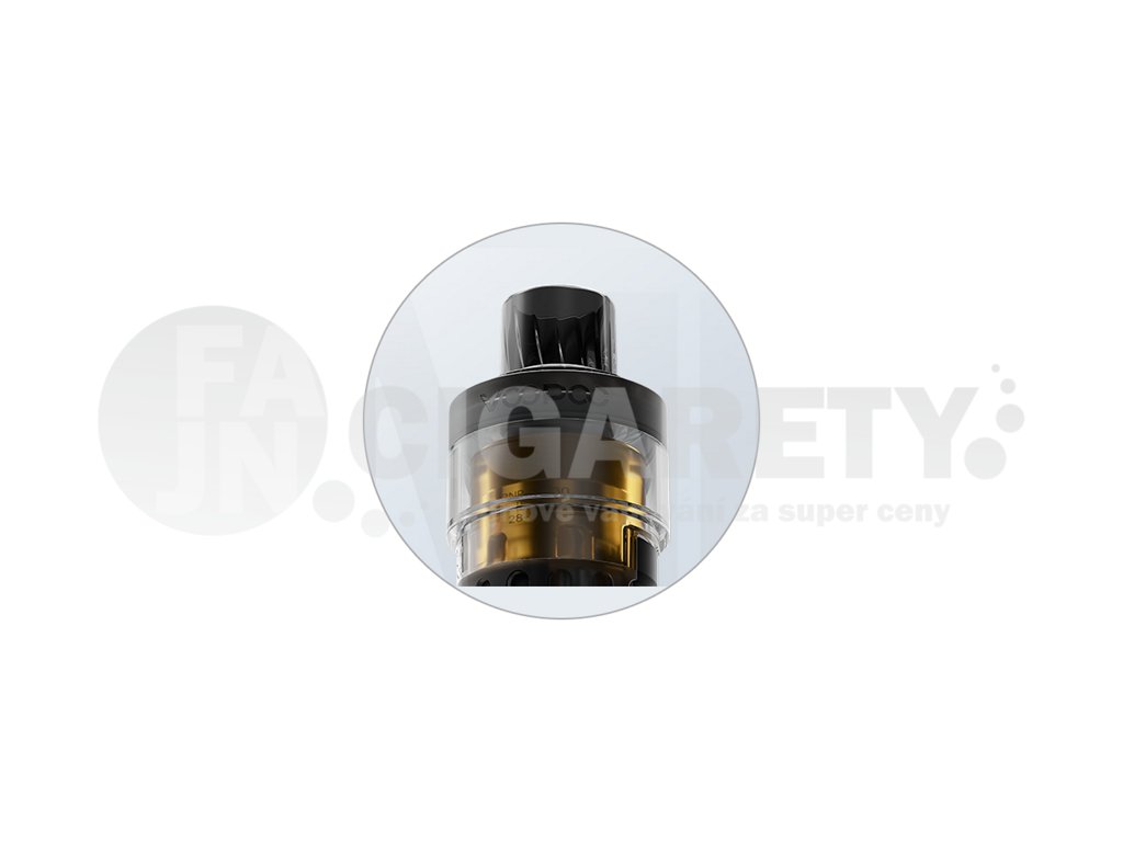 Cartridge VooPoo PnP Pod II ve vrchní části se pyšní obrovským objemem. Do cartridge lze doplnit až 5 ml e-liquidu, díky této velké kapacitě tak nabídne dlouhou výdrž na jedno naplnění i v případě intenzivnějšího DL potahování. V případě potřeby navíc můžete cartridge kdykoliv odpojit a doplnit ji prostřednictvím spodního systému plnění.