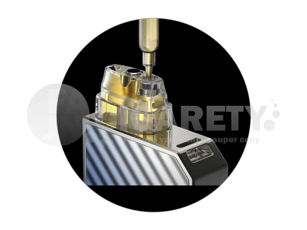 Novinkou je přítomnost jednoduchého a praktického systému plnění cartridge. Tu již nebudete muset odpojovat od těla baterie. V případě, že vám dojde uvnitř cartridge e-liquid, jednoduše sejmete vrchní náustek a během pár vteřin doplníte e-liquid zpátky do cartridge. Proces je intuitivní, jednoduchý a velice rychlý a pohodlný.