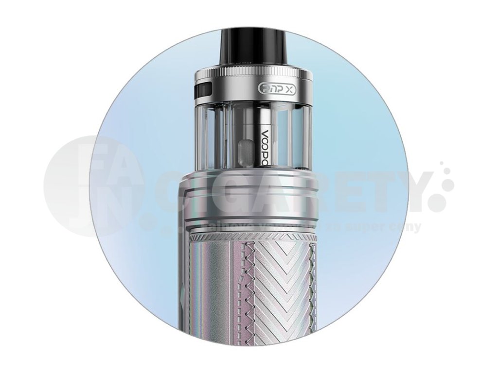 Druhá generace populárních modelů e-cigaret Voopoo Drag S a Drag X přináší celou řadu vylepšení v čele s upgradovaným čipsetem, přepracovaným rozhraním, podporou většího množství režimů, větším objemem a novou platformou PnP-X pro co nejlepší výsledky při vapování. Verze VooPoo Drag X2 Pod Kit nabídne elegantní a moderně zpracované tělo ze zinkové slitiny a kůže. Samozřejmostí jsou potom opět praktické rozměry a ergonomicky zaoblené hrany v zadní části pro komfortní stisk v dlani. Tělo zařízení ukrývá slot pro vlastní baterii typu 18650. Díky pohonu na externí baterii si dokáže model Drag X2 poradit s výstupním výkonem až 80 W. Externí baterii potom můžete pohodlně dobíjet také přímo v těle e-cigarety díky USB-C portu s podporou 2A nabíjení v přední části.