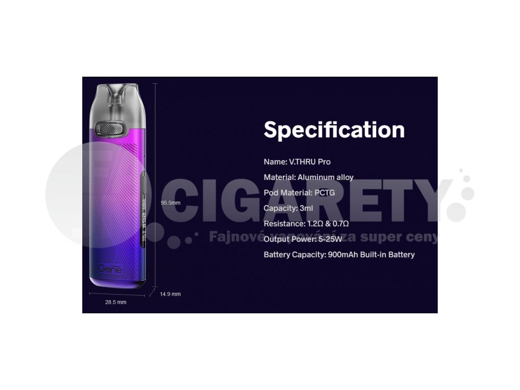 Není určeno pro náplně obsahující nikotin! Elektronická cigareta VOOPOO V.THRU Pro připomíná na první pohled svými rozměry legendární Joyetech Teros, ale svými vlastnostmi je tento kousek absolutní špičkou mezi POD systémy. Odlehčené tělo e-cigarety disponuje vestavěnou baterií o kapacitě 900mAh, automatickým spínačem, nastavitelným výkonem od 5W do 25W a 0,69 palcovým displejem. Vyměnitelné cartridge (POD) o objemu 3ml nabízí dva odpory žhavicích hlav, a to 0,7ohm a 1,2ohm.