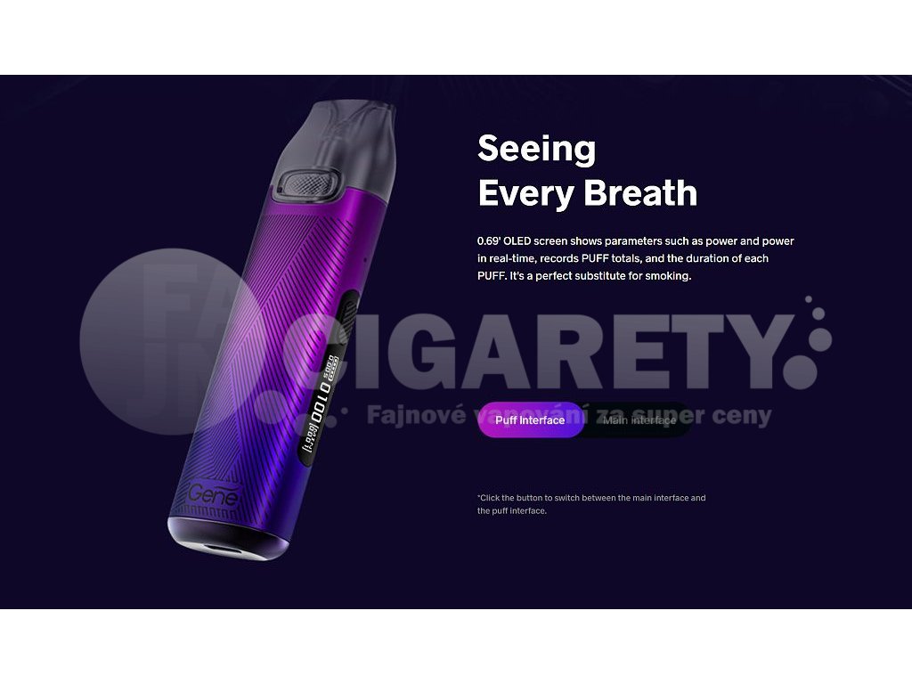 Cigaretu pohání čip GENE, který dodává konstantní výstupní napětí. Těšit se tak můžete na dokonale hladký a příjemný potah, nebo na možnost regulace výstupního výkonu. Ten lze regulovat v rozmezí 5 - 25 W pomocí jednoho jediného tlačítka. Na 0,69 palcovém OLED displeji se zobrazují veškěré potřebné informace o zařízení. Elektronická cigareta disponuje inteligentním režimem dětské pojistky, aby se zabránilo náhodnému spuštění dětmi. Samotná Pod Cartridge disponuje magnetickým uchycením a její doplňování a případná výměna je tak otázkou několika málo vteřin.
