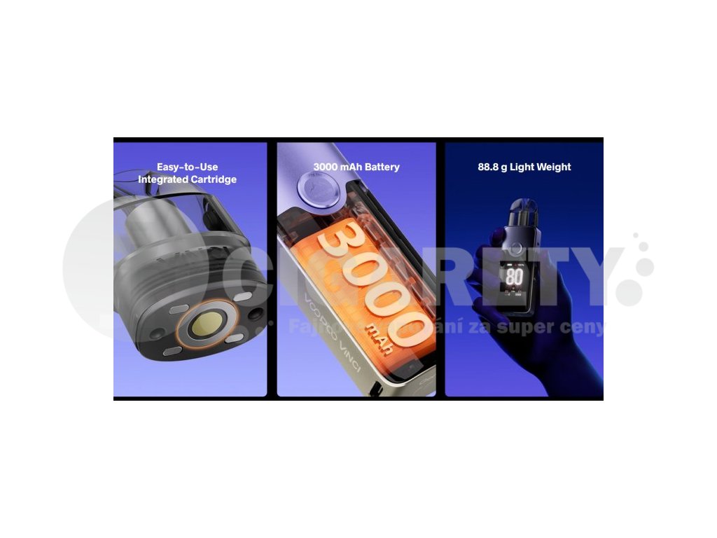 Sada VOOPOO VINCI E80 kombinuje vysoký výkon s uživatelsky přívětivým designem, díky čemuž je ideální jak pro úplné začátečníky, tak i zkušené vapery. Díky masivní vestavěné baterii o kapacitě 3000mAh poskytuje zařízení až 80W nastavitelného výkonu pro optimální zážitek z DTL na MTL vapování. Nová cartridge VINCI E o objemu 5ml je k dispozici s variantami odporu 0,3/0,6 a 0,8ohmu, což umožňuje bohatou chuť a flexibilitu páry. E80 je vyrobena z odolné hliníkové slitiny a vybavena TFT 1,47palcovým displejem, takže vyvažuje funkčnost s přenosností.