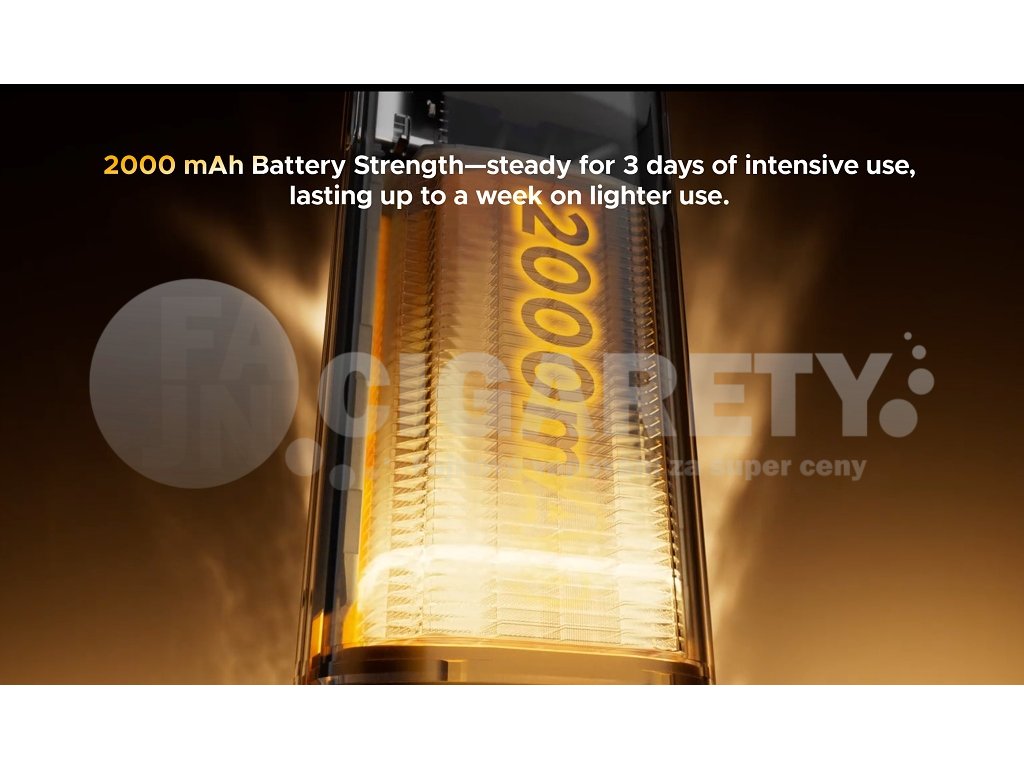 BaterieIntegrovaná baterie s kapacitou 2000mAh poskytuje vynikající výdrž pro celodenní vapování bez nutnosti častého nabíjení. Stabilní dodávka energie zajišťuje konzistentní výkon až 40W po celou dobu používání. Baterie je trvale zabudovaná v těle zařízení pro maximální kompaktnost a jednoduchost obsluhy. |