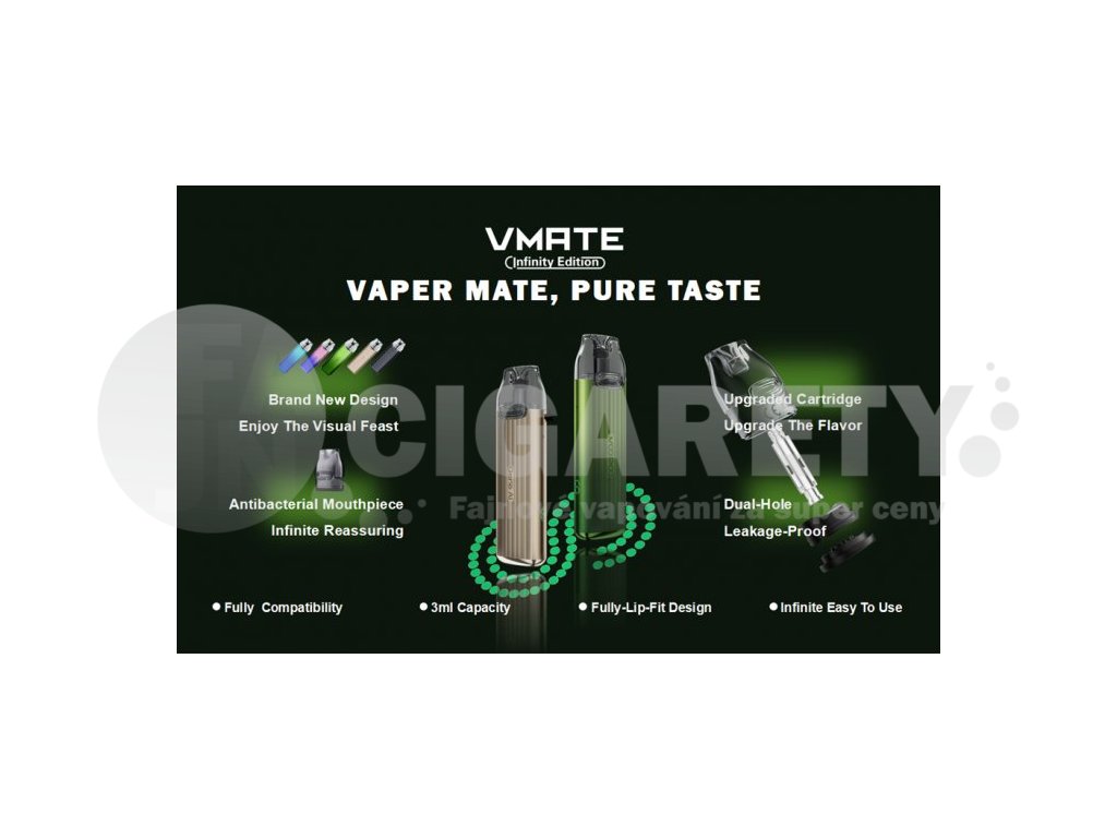 Není určeno pro náplně obsahující nikotin! Antibakteriální náustek, technologie ITO (mesh žhavící síťka) a vylepšená konstrukce proti nechtěnému úniku liquidu s duálním přívodem vzduchu, to je nová elektronická cigareta VOOPOO VMATE Infinity. Odlehčené tělo baterie disponuje vestavěným monočlánkem o kapacitě 900mAh, automatickým spínačem, USB-C nabíjecím portem a výkonem až 17W. Vyměnitelné cartridge (POD) o objemu 3ml nabízí oblíbený odpor 0,7ohm pro MTL vapování.