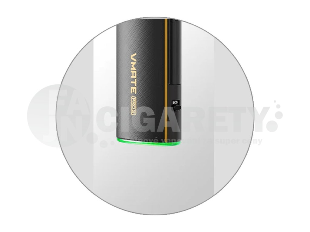 Oblíbený ECO režim je zpět. U e-cigarety najdete rovnou dva výstupní režimy, přičemž přepínání mezi nimi je snazší, než kdykoliv předtím. Na předním panelu najdete manuální přepínač, jedním pohybem prstu si tak přepínáte mezi výchozím režimem POWER nebo úsporným režimem ECO. V režimu ECO nastaví e-cigareta výkon automaticky za vás a zároveň dojde k potemnění displeje a snížení jasu, aby nedocházelo k nadměrnému přetěžování a vybíjení baterie.