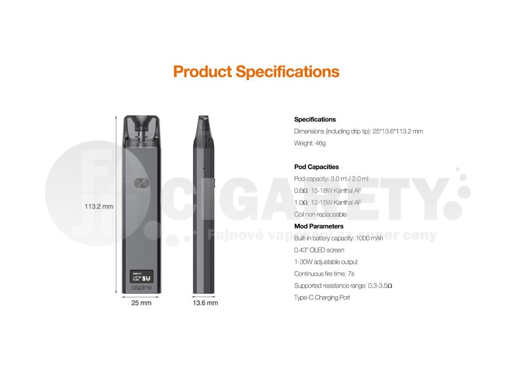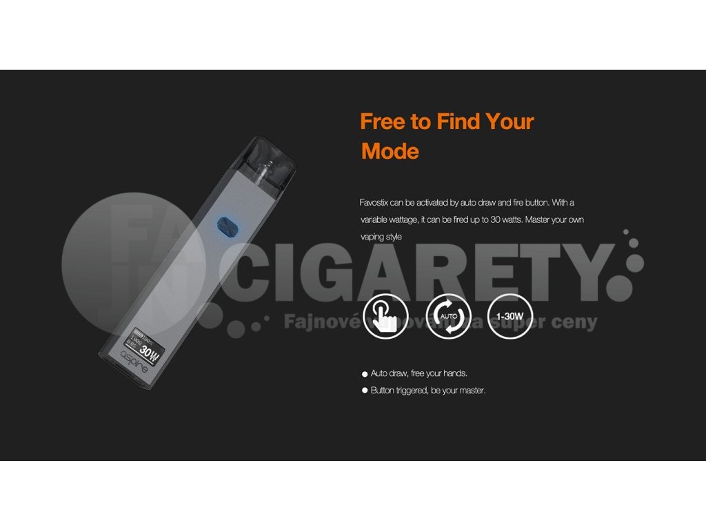 Elegantní Pod elektronická cigareta vyrobená z hliníkové slitiny. Velmi vhodná pro náplně s nikotinovou solí a podporou RDTL i MTL potahování, OLED displej, automatický i manuální aktivace potahu, výkon až 30W, baterie 1000mAh, USB-C nabíjení, plnitelné Pod Cartridge Aspire Favostix.