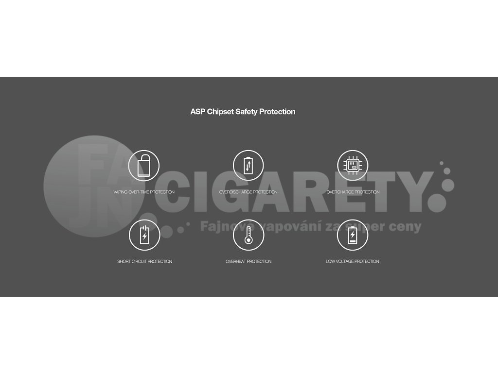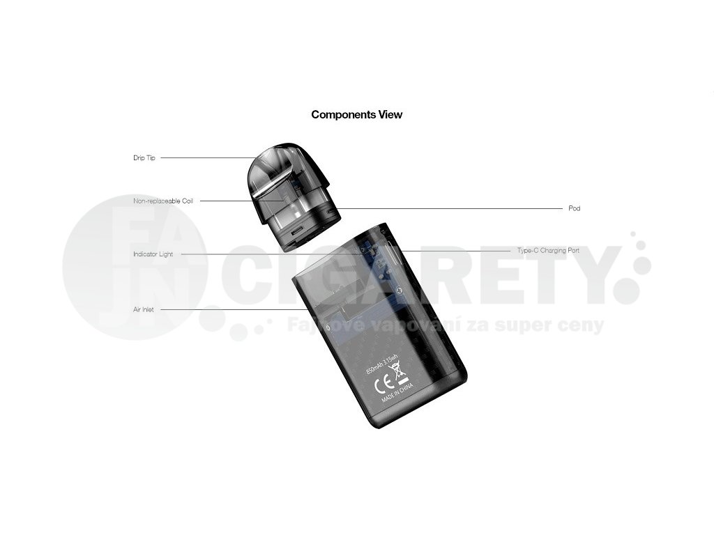 Malá a lehká Pod elektronická cigareta s integrovanou baterií o kapacitě 850mAh, automatická aktivace potahu, rychlé USB-C nabíjení, lehce vyměnitelná a plnitelná Pod cartridge o objemu 3ml s integrovanou žhavící hlavou s odporem 0,8ohm. Rozměry: 75mm x 40mm x 15,8mm.