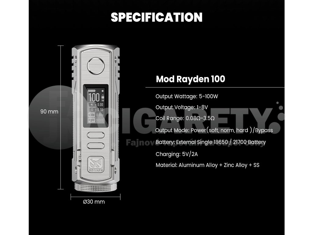 Výkonové možnostiRayden nabízí variabilní výkon 5-100W s režimy soft, normal a hard pro různé styly žhavení. Podpora odporů 0,08-3,5 ohmu umožňuje širokou kompatibilitu s atomizéry. |