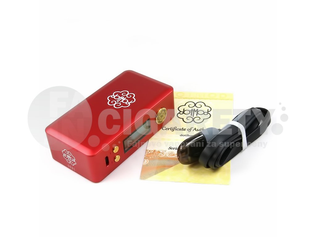 Elektronický grip Dotmod dotBox 75 W je zařízení určené pro opravdové fajnšmekry v oblasti elektronického kouření, jejichž výsadou je naprostá prvotřídní kvalita. Tento luxusní plně regulovatelný grip tyto požadavky beze zbytku splňuje. Jedná se o jedno článkový mod, který se může pochlubit mimořádně spolehlivou elektronikou, opravdu krásným zpracováním těla do posledního detailu. Oblé hrany pak zajišťují dokonalou ergonomii a velmi pohodlné držení v ruce i při celodenním používání. Tělo dotBoxu je celé zhotoveno z anodizovaného hliníku, což přináší příjemný komfort v podobě lehkého přenášení a povrchová úprava zase zabraňuje vyklouzání z rukou. Boční straně krytu baterie dominuje samotné logo výrobce. Na horní části dotBoxu je umístěn již klasický závit 510, který je kompatibilní s drtivou většinou Clearomizerů a jeho předností je pozlacený centrpin. Nejedná se jen o nějaké pozlátko v podobě nanesené vrstvy barvy, ale o vrstvu 24 karátového zlata, díky které dochází k dokonalé vodivosti pro okamžitý přenos proudu ke žhavící hlavě. Tento centrpin je navíc plně odpružený, což zaručuje nepřerušované spojení s kontaktem žhavící hlavy umístěným v závitu Clearomizeru.