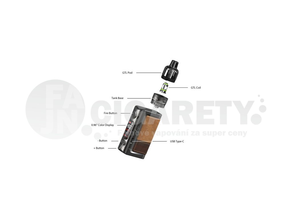 Ve vrchní části najdete závit typu 510 pro kompatibilitu s atomizéry se stejným typem uchycení. Tělo modu je poháněno prvotřídním čipem Avatar pro perfektní výsledky při žhavení. Čip nabídne přehledné uživatelské rozhraní, efektivní náběh žhavení a tři výstupní režimy. Najdete zde režim výkonu s hodnotou až 160 W, režim Smart pro inteligentní detekci připojeného tělíska a nastavení doporučeného výkonu a režim Voltage pro regulaci výstupního napětí. Clearomizér Eleaf GTL Pod Kit nabídne vše potřebné pro všechny typy vaperů. Můžete ho používat na utaženější DL, nebo na vzdušnější MTL potah, zároveň nabídne objem 4,5 ml pro dlouhou výdrž bez potřeby plnění. Ve spodní části si můžete regulovat přísun vzduchu. Jedná se o vynikající soupravu modu a clearomizéru, se kterou se nebudete ani na vteřinu nudit.