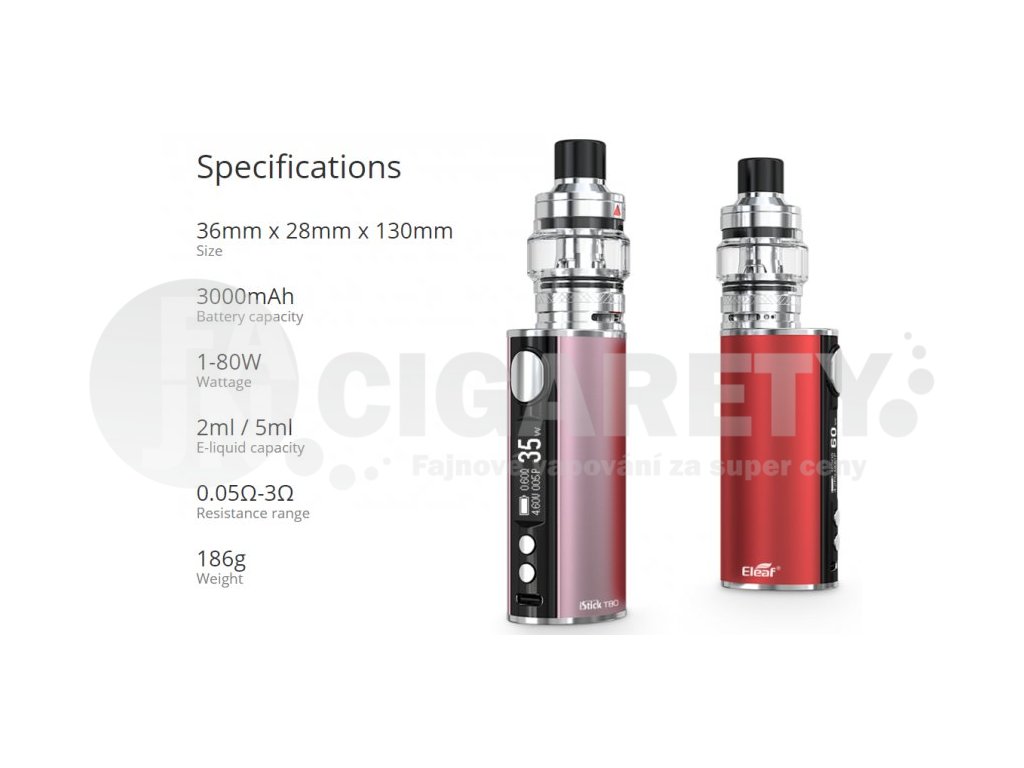 Není určeno pro náplně obsahující nikotin! iStick T80 je novým členem nejpopulárnější a nejoblíbenější řady gripů od Eleaf. Celokovové tělo ukrývá vestavěnou baterii o kapacitě 3000mAh, která je podporována inovativním systémem rychlého nabíjení QC3.0 s dobou nabíjení pouhých 90-ti minut. iStick T80 nabízí nastavitelný výkon až 80W. Přehledný OLED displej nabízí detailní informace o nastavení. Mezi jeho další přednosti patří ochrana proti zkratu, přehřátí, přežhavení, nízkému odporu a 10-ti vteřinová ochrana žhavení. Výrobce k této sadě přiřadil nový clearomizer Pesso s dětskou pojistkou, který vybavil konvexní nádržkou z Pyrexu o objemu 5ml s jednoduchým systémem horního plnění - po odsunutí vrchní části plníte liquid otvorem přímo do těla clearomizeru. Pesso spolupracuje se žhavicími hlavami EF, které nabízejí klasickou kanthalovou variantu o odporu 0,3ohm a čím dál více oblíbenější mesh spirálku o odporu 0,6ohm. Celý clearomizer je plně rozebíratelný = snadná údržba. Regulace přívodu vzduchu pro nastavení optimální kouřivosti se nachází ve spodní části.
