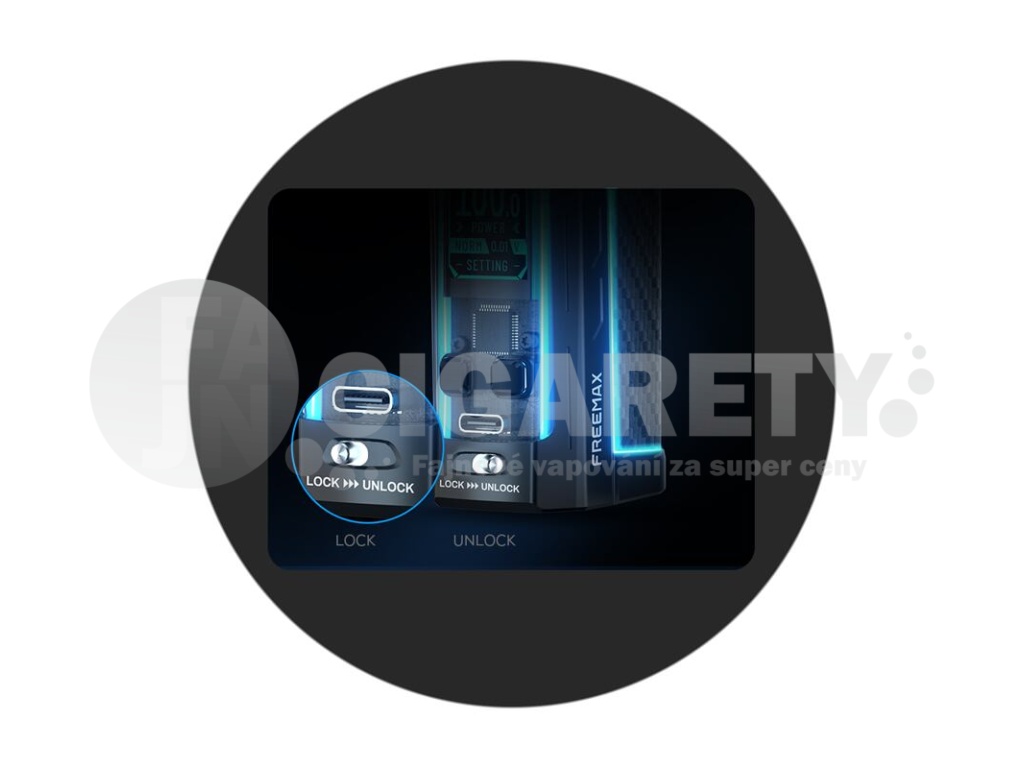 Na předním ovládacím panelu modu se nachází oblíbený prvek v podobě manuálního zámku. Jednoduchým pohybem tak můžete mod uzamknout a zabránit tak nechtěnému sepnutí, nebo přenastavení hodnot, například při častém přenášení v kapse, nebo v cestovním zavazadle. Přejetím prstu můžete mod opět jednoduše odemknout a opět se začít věnovat vapování.
