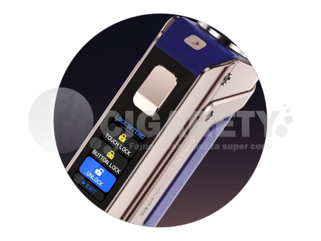 Aegis Legend 3 se pyšní inovativní technologií inteligentního zámku. Ten se dá aktivovat v nastavení. Na výběr máte režimy TOUCH, BUTTON a UNLOCK. V režimu Unlock můžete zařízení ponechávat odemčené. V režimu BUTTON se aktivuje funkce zámku pomocí spínacího tlačítka. Nejzajímavějším režimem je potom inteligentní TOUCH, zadní část modu je opatřena elektronickým systémem rozpoznání přiložené dlaně, jakmile mod sevřete v dlani a stisknete spínací tlačítko, zařízení se odemkne a potah se aktivuje.