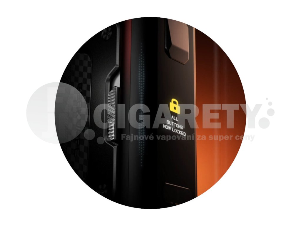 Jednoduchý mechanický posuvník A-Lock slouží jako rychlá a efektivní ochrana před náhodným spuštěním žhavení nebo přenastavení hodnot, když jej přenášíte například v kapse. Zároveň funguje jako bezpečnostní pojistka proti odemčení modu dětmi. Díky zdrsněnému povrchu a strategickému umístění v boční části modu je možná pohotová aktivace a deaktivace jednou rukou.