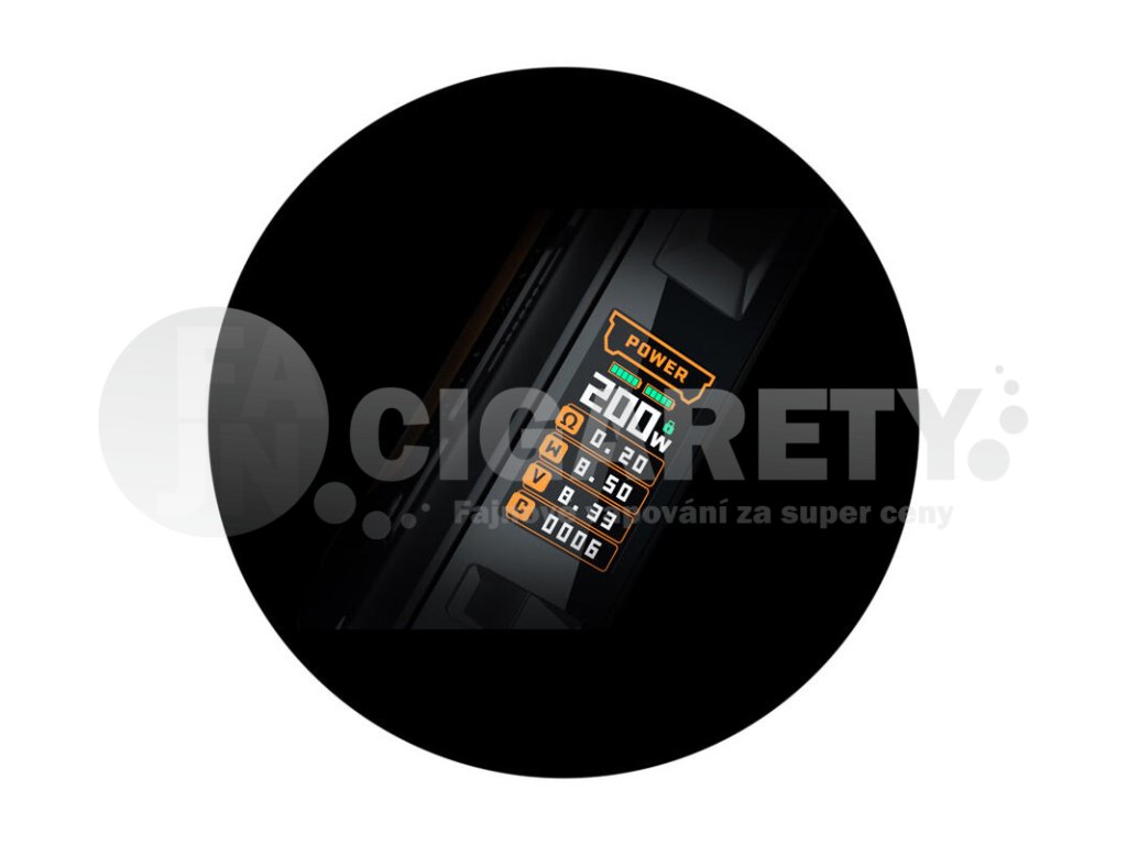 Díky pohonu na dvě baterie se můžete těšit nejenom na extrémně rychlý náběh žhavení, ale také na vysoký výstupní výkon. Ten totiž dosahuje až 200 W. Mod tak bez problému uspokojí i ty nejnáročnější vyznavače cloud chasingu a přímého potahování do plic. Výkon si můžete pohodlně regulovat pomocí regulačních tlačítek v rozpětí 5 - 200 W. Nastavení celého modu je nesmírně snadné a intuitivní.