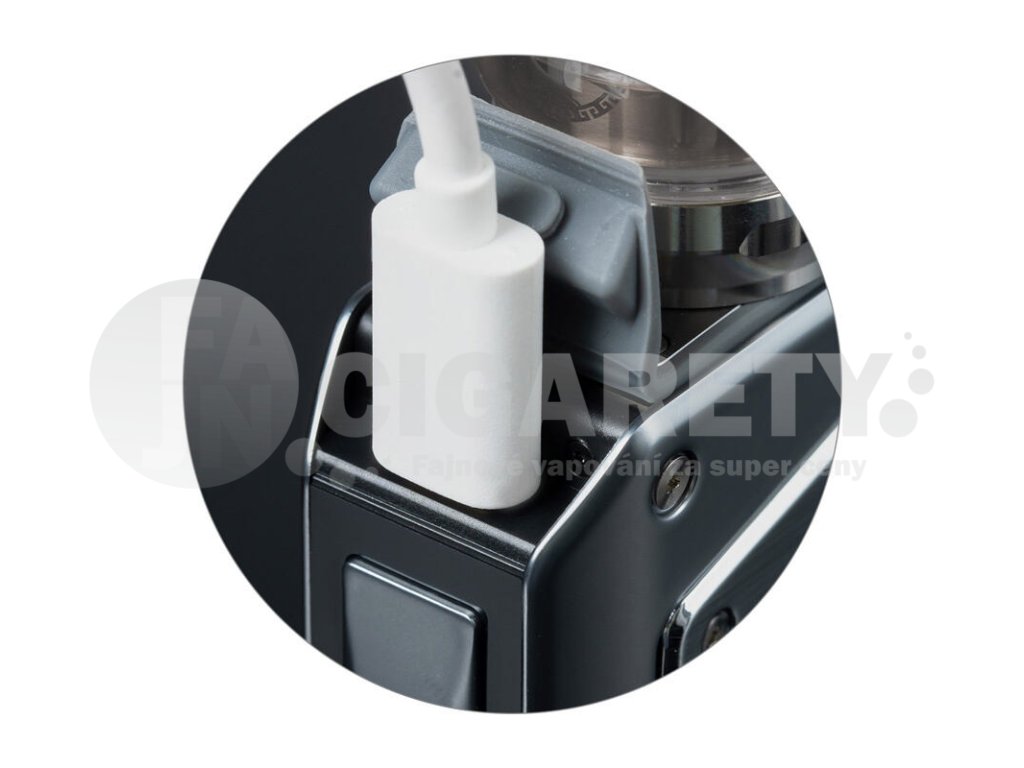 Uvnitř těla se nachází slot pro vložení baterií. Mod pracuje se dvěma bateriemi typu 18650. Tyto baterie nejsou součástí základního balení a je nutné dokoupit je samostatně. Díky pohonu na externí baterie dosáhnete vždy mimořádných výsledků při žhavení, těšit se můžete také na extrémně rychlou odezvu žhavení a stabilní chod zařízení. Externí baterie navíc můžete pohodlně dobíjet přímo v modu díky USB-C portu na těle zařízení.