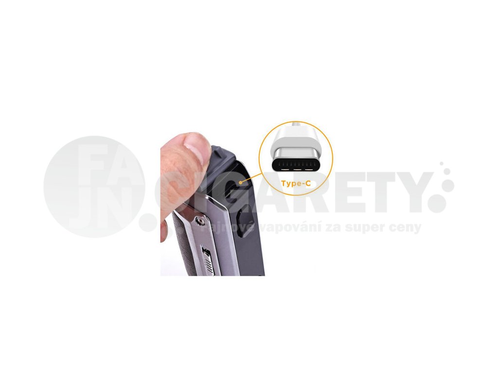 Ve spodní části se nachází šroubovací uzávěr, který ukrývá slot pro jednu baterii typu 18650. Po vložení baterie je možné začít využívat mod naplno. Díky pohonu na jednu externí baterii je zajištěn vysoký výstupní výkon a rychlý náběh žhavení. Baterie není součástí balení a je nutné dokoupit ji k modu samostatně. Baterii 18650 je možné dobíjet přímo v modu díky USB-C portu na těle.