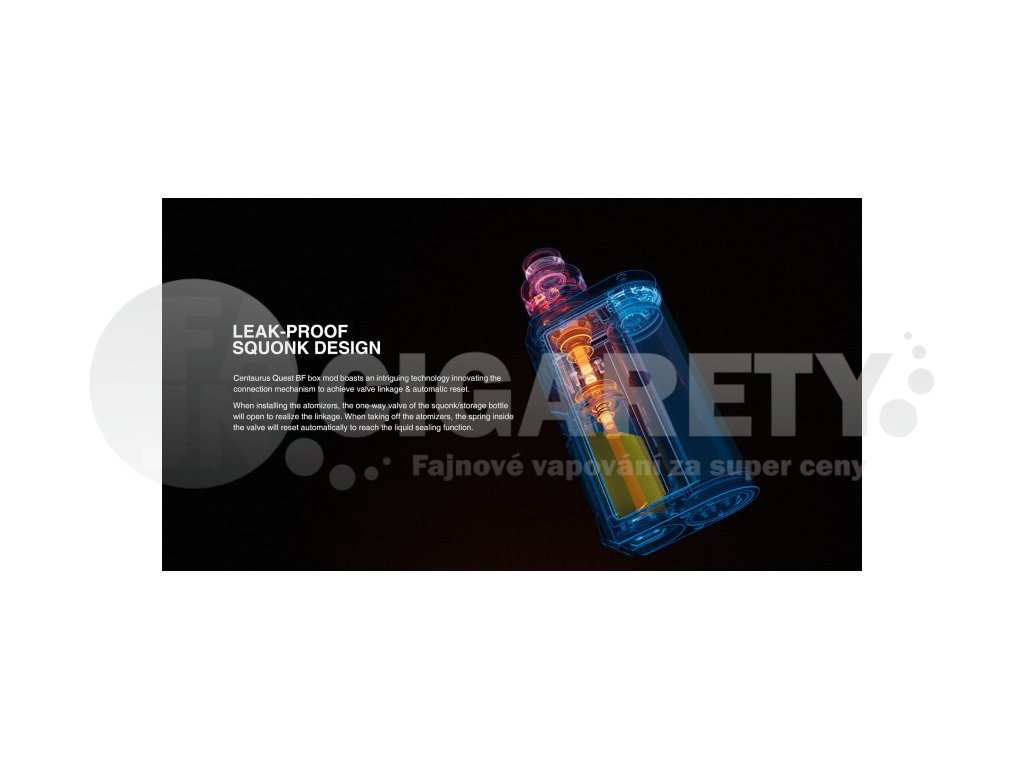 Centaurus Quest BF, jak je patrné již od prvního pohledu, přináší unikátní design, ultimátní pohodlnost a špičkovou kvalitu. Tento jedinečný bottom feeder posouvá Squonking na novou úroveň. Velmi chytře navržená Squonk lahvička pojme neuvěřitelných 9,5ml e-liquidu a vy se tak nemusíte obávat, že vám náplň přes den dojde a můžete bezstarostně vapovat. Centaurus Quest BF přináší ohromující technologii zabraňující protékání, což může být u Squonk zařízení často problém. Při osazování atomizérem se spustí jednosměrná páčka, která zajistí plné těsnění a nulové protékání a při sundání ji automaticky resetuje drobná pružinka. Mod pracuje s jedním externím monočlánkem typu 21700 / 20700 / 18650 (s použitím přiloženého adaptéru) a kromě možnosti nabíjet baterii externě, disponuje rychlým USB-C nabíjením. Je poháněn exkluzivním chipsetem Quest 2.0, který zaručuje plynulý chod, nabízí několik režimů vapingu a nechybí mu ani mnohé standardní bezpečnostní prvky. Centaurus Quest BF umožňuje nastavení výkonu až na 100W a vybrat si můžete z WW módu s extra nastavením intenzity mezi soft, norm a hard, VPC, Bypass, VV i TC (SS904 / SS316 / Ti / Ni). Ovládání pomocí tří tlačítek a prostorný barevný TFT displej spolu s USB-C portem najdete na boční straně Modu.