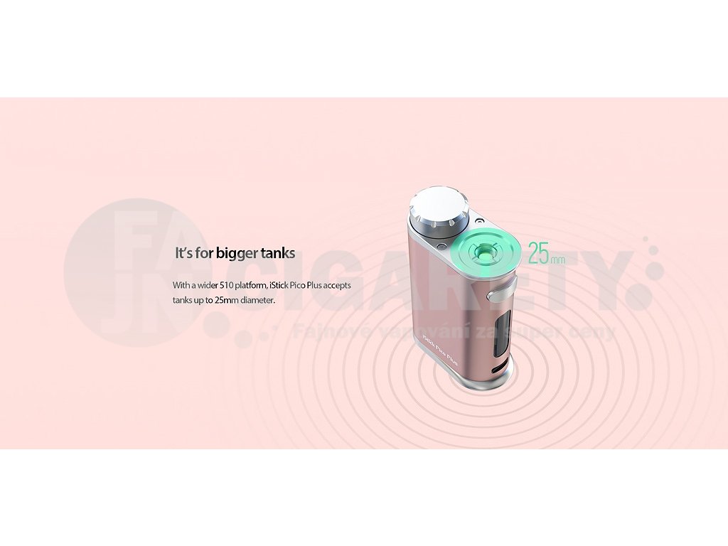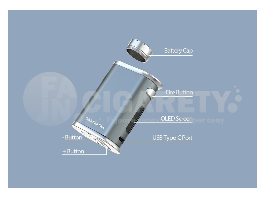 Nástupce oblíbeného iStick Pico, tentokrát s přívlastkem Plus. Vysoký nastavitelný výkon až 75W, na baterie typu 18650, rychlé USB-C nabíjení, OLED displej, závit 510. Baterie nejsou součástí balení. Barevné provedení Silver.