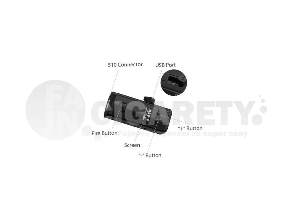 V kompaktním těle modu se nachází integrovaná baterie s kapacitou 950 mAh. Tato baterie se postará o skvělý náběh žhavení a dlouhou výdrž i při intenzivním používání. V případě potřeby pak stačí připojit micro USB kabel k portu na zařízení a baterii si můžete opět kdykoliv pohodlně dobít. Lze dobíjet proudem až 1A.