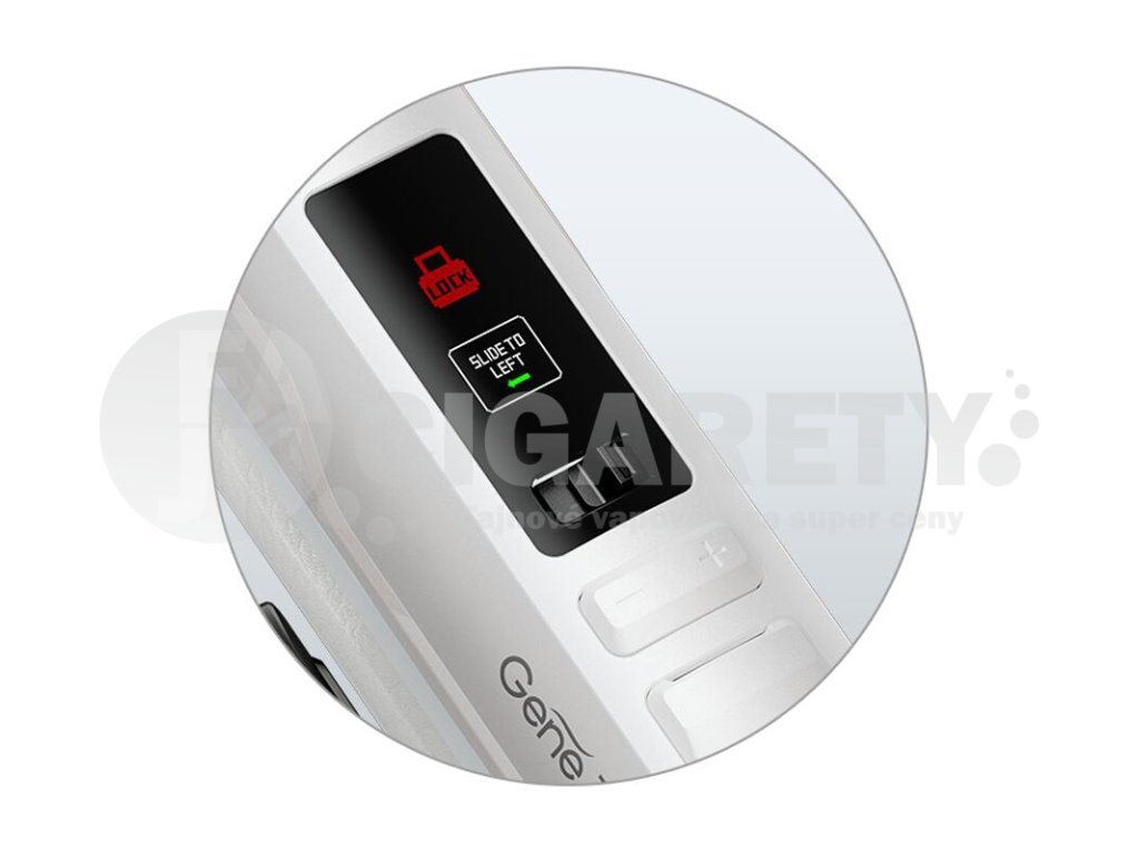 Přímo u displeje se nachází praktické zamykací tlačítko. Jeho posouváním tak můžete mod uzamykat, či odemykat. Manuální zámek využijete například při častém přenášení modu v kapse, nebo v cestovním zavazadle, zabraňuje nechtěnému a samovolnému sepnutí zařízení, slouží však také jako praktická dětská pojistka.