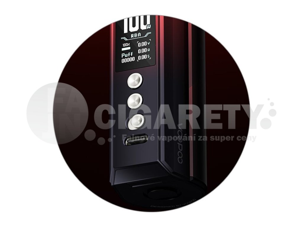Po představení dvoubaterkového modu Drag 4 představuje výrobce VooPoo také jeho menšího sourozence. Grip VooPoo Drag M100S nabídne jednobaterkový provoz, bohatou nabídku režimů, vysoký výstupní výkon a další oblíbené prvky, na které jste mohli narazit již u modelu Drag 4. V prvé řadě však láká na esteticky dokonalý design. Celé tělo modu je vyrobeno z kvalitní zinkové slitiny, přičemž nabídne matnou povrchovou úpravu pro minimalizaci vzniku otisků prstů na těle. Dvě barevné varianty tohoto modelu (Antique Brass & Padauk, Black & Darkwood) potom nabídnou také dřevěné doplňky pro nekompromisně odladěný design. V jádru modu se nachází slot pro vložení jedné baterie typu 21700, nebo 18650 s adaptérem. Díky pohonu na jednu baterii si mod poradí s výstupním výkonem až 100 W, výkon lze potom libovolně regulovat v rozpětí 5 - 100 W ve standardním režimu.