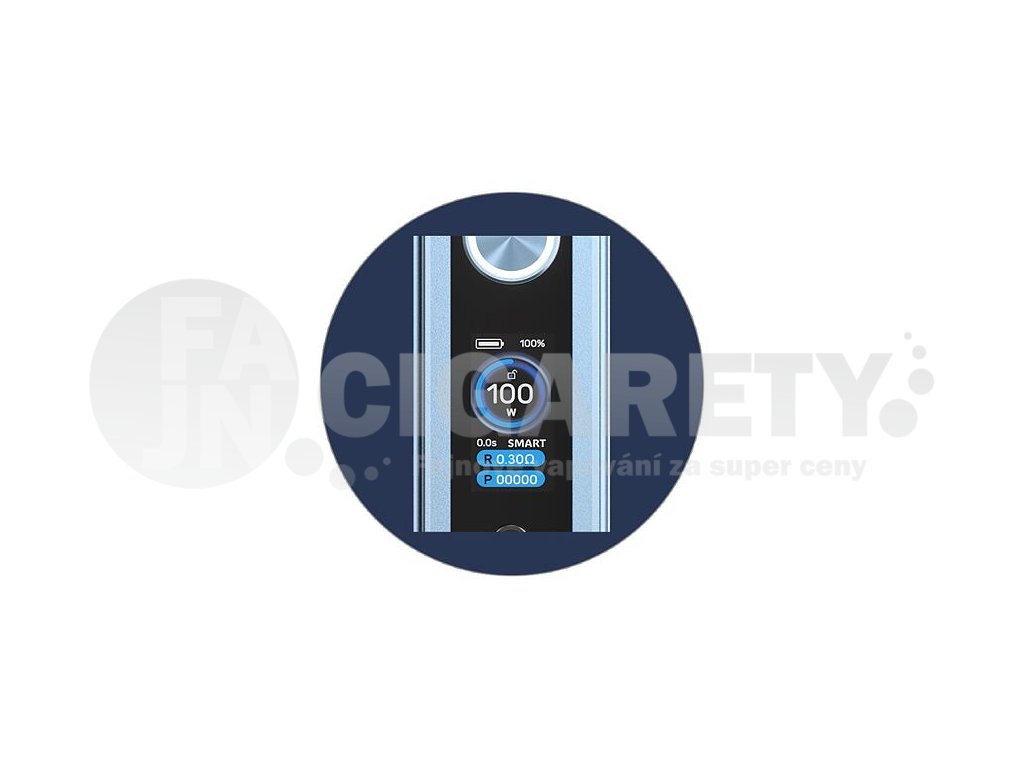 Na předním ovládacím panelu nenajdete jen praktický barevný displej a regulační tlačítka, ale také praktický manuální vypínač, který slouží pro snadné a rychlé uzamčení nebo odemčení modu. Díky tomu můžete mod bezpečně přenášet například v cestovním zavazadle a nemusíte se obávat nechtěného samovolného spuštění žhavení.