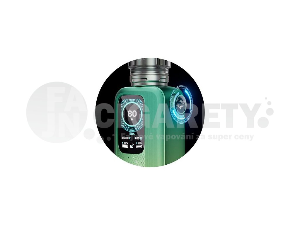 Přednímu panelu dominuje obří TFT displej o úhlopříčce 1.47 palce s jemným rozlišením. Všechny informace jsou díky kvalitě displeje jasně viditelné i na přímém slunci. Během vapování budete mít neustále plnou kontrolu a jedním pohledem si vždy snadno ověříte nastavené parametry nebo aktuální stav nabití. Na výběr je dokonce ze 3 schémat, které ovlivňují grafiku pozadí a strukturu informací zobrazených na displeji. Vizuální požitek z vapování potom umocňuje doprovodná animace, která se na displeji objeví po stisknutí hlavního tlačítka.