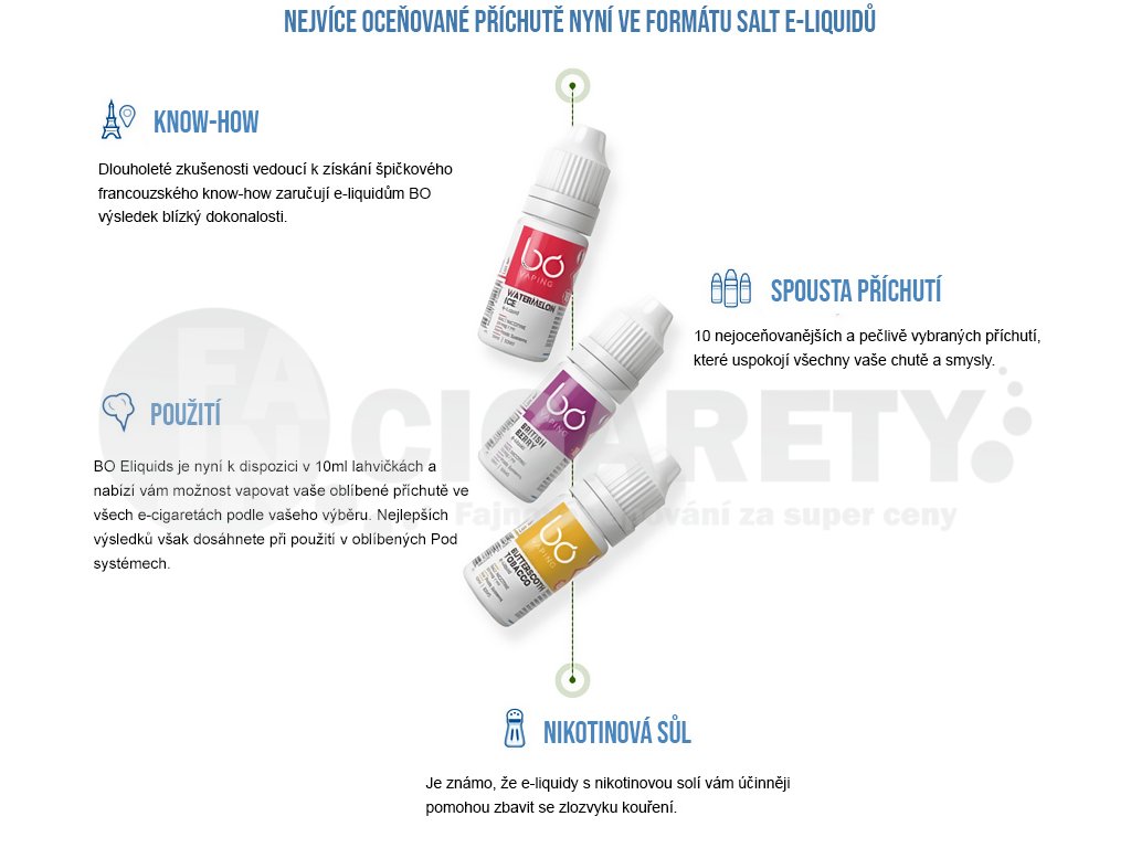 Hříšná směs, elegantní bohatost charakteristická pro tradiční virginský tabák, smíchaný s lehkým nádechem sladkého karamelu. E-liquid s nikotinovou solí francouzského výrobce BO Vaping a poměrem PG 50%, VG 50%.