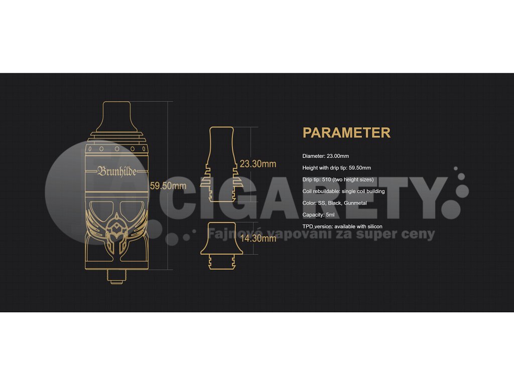 Špičkový RTA atomizér Vapefly Brunhilde, speciálně navržený pro MTL vapování. Vyroben z kvalitní nerezové oceli a rozměrech 59,5 x 23mm. Objem 5ml, závit 510. Top Coiler (Žhavící spirála se nachází v horní části atomizéru). Regulace Airflow.