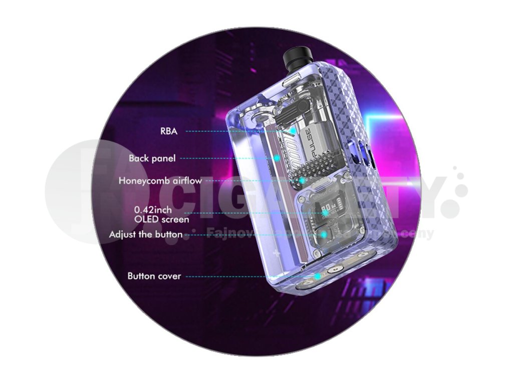 Na bočním a předním panelu se nachází řada menších otvorů určených k přísunu vzduchu ke cartridgi. Díky pečlivému rozvržení těchto vzduchových otvorů proudí vzduch do těla zařízení rovnoměrně a zajišťuje tak jemnou a hladkou produkci páry s maximálním důrazem na výraznou a prokreslenou chuť e-liquidu.