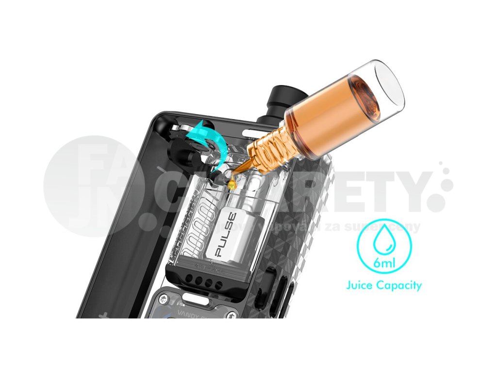 Druhá generace pokročilého pod modu Pulse AIO od výrobce Vandy Vape se představuje v přepracovaných barevných variacích s maximálním důrazem na variabilitu a široké možnosti vlastního nastavení. Do kompaktní konstrukce zařízení z hliníkové slitiny můžete vložit jednu baterii typu 18650. Díky speciální RBA cartridgi Pulse AIO V2 s objemem 6ml si můžete přizpůsobit vaping svým přestavám instalací vlastní spirály a vaty. Se širokými možnostmi výměny interních vzduchových vložek si model dokáže poradit se všemi typy vapingu, to vše navíc v rozsahu výkonu 5 - 80W. Profesionální vaping se vším, co k tomu patří, to je Pulse AIO V2.