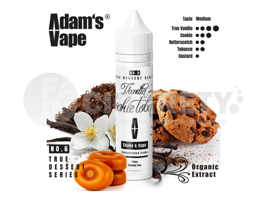 Typická vůně pravé vanilky se mísí s čerstvými cookies a suchým tabákem. Při potažení se všechny chutě sjednotí do komplexního celku. Karamel a custard při výdechu celý chuťový profil zakulacují a vyvažují..... Vyladěné příchutě od českého výrobce Adam´s Vape. Příchutě jsou dodávány v 60ml plastových lahvičkách, které obsahují 12ml koncentrátu. Uživatel tak pouze přidá bázi do lahvičky, zatřese s ní a má hotový e-liquid.... Jedná se o koncentrát, který se kape do báze. Výroba probíhá za nejpřísnějších hygienických standardů ve farmaceutické laboratoři....nejedná se o hotový liquid.