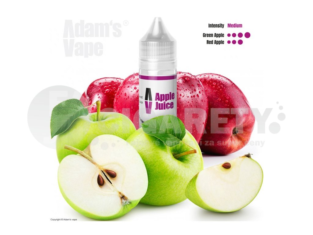 Vůně je výrazně jablečná, při potažení ucítíte sladkost červených a kyselost zelených jablek. Chuť je komplexní, nasládlá s mírně kyselým nádechem, bez jakýchkoliv nepříjemných tónů.... Vyladěné příchutě od českého výrobce Adam´s Vape. Příchutě jsou dodávány v 60ml plastových lahvičkách, které obsahují 12ml koncentrátu. Uživatel tak pouze přidá bázi do lahvičky, zatřese s ní a má hotový e-liquid.... Jedná se o koncentrát, který se kape do báze. Výroba probíhá za nejpřísnějších hygienických standardů ve farmaceutické laboratoři....nejedná se o hotový liquid.