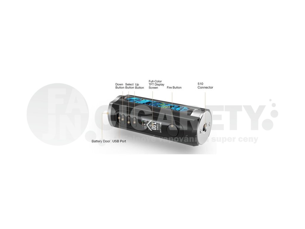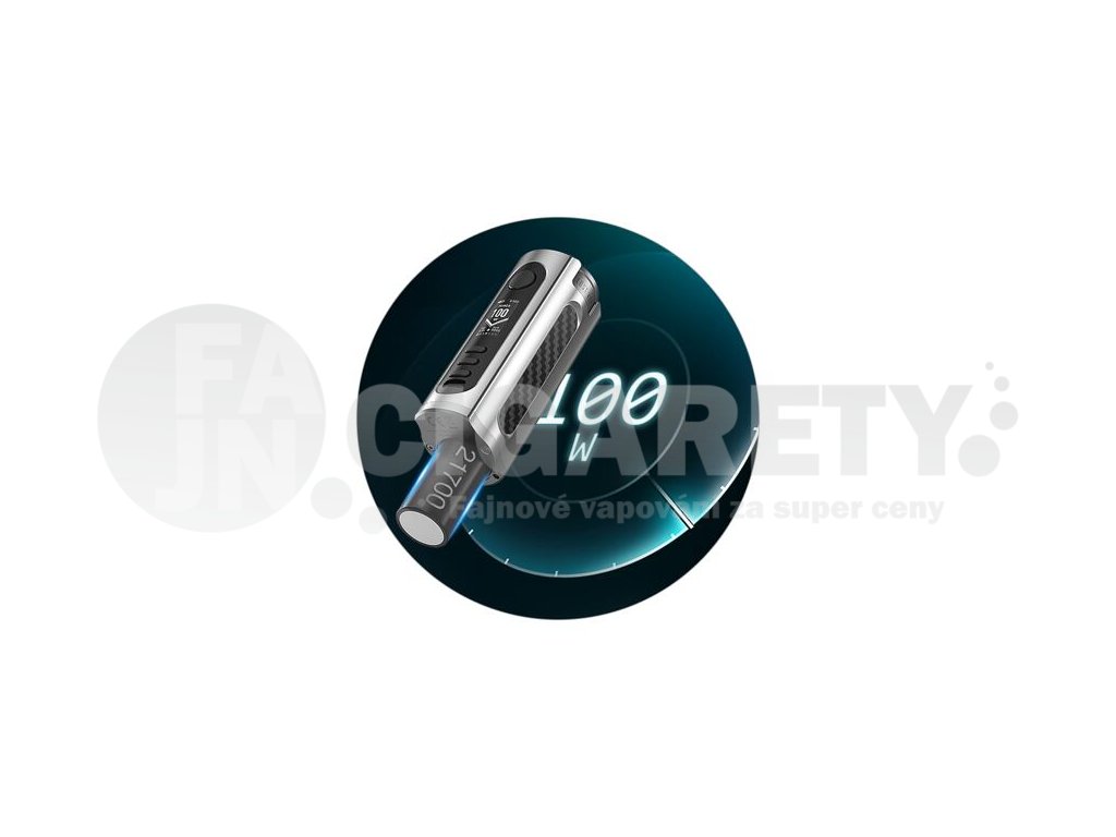 Ve spodní části se nachází slot pro jednu baterii typu 21700, nebo 20700. Díky podpoře těchto nových článků se můžete těšit na stabilní výkon v průběhu žhavení a na dlouhou výdrž. Mod pracuje s maximálním výstupním výkonem až 100 W. Uspokojí tak i ty nejnáročnější příznivce DL vapingu. Do modu můžete použít také standardní baterii 18650 díky adaptéru v základním balení.
