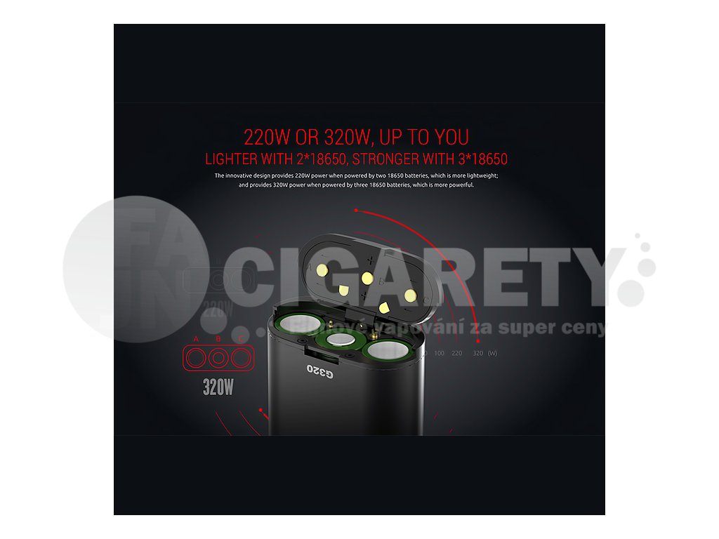 Smoktech G320 Marshal patří mezi menší přístroje pro vaping, ale svým výkonem až 320W se z něj stal bezkonkurenční vítěz mezi vysokovýkonnými gripy. I přes svůj malý rozměr (89,5mm x 61,5mm x 31mm) využívá tři monočlánky typu 18650 (min. 25A), avšak lze použít monočlánky pouze dva, a to s maximálním výkonem až 220W. Vedle klasického VW režimu Marshal disponuje i teplotními mody TC-Ni/Ti/SS a TCR. V horní části je velký OLED displej, který Vás informuje o aktuálním výkonu, teplotě, napětí, odporu, proudu, režimu, počtu potahování a kapacitě baterie bez jakéhokoliv přepínání. Nabíjení umožňuje micro USB vstup.